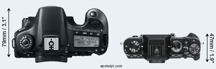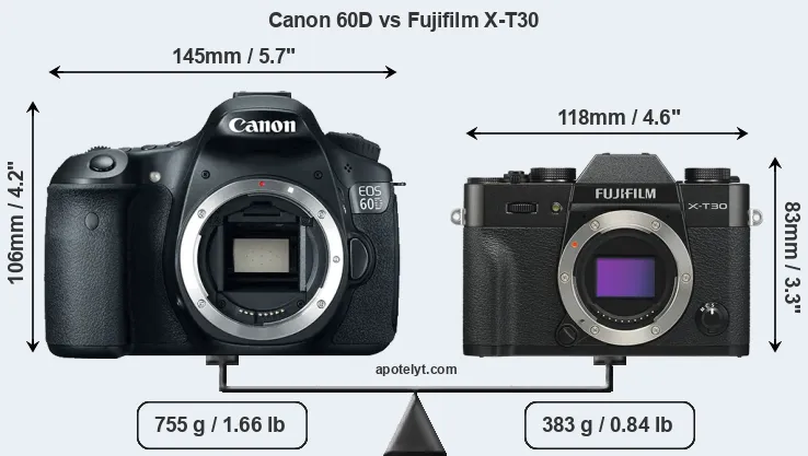 Die physische Größe und das Gewicht der Canon 60D und der Fujifilm X-T30 werden in der nachfolgenden Graphik illustriert. Die beiden Kameras werden entsprechend ihrer relativen Größe dargestellt. Alle Größenangaben sind auf den nächsten Millimeter gerundet.