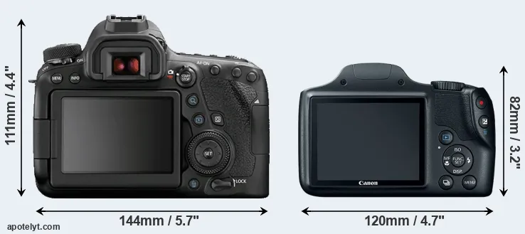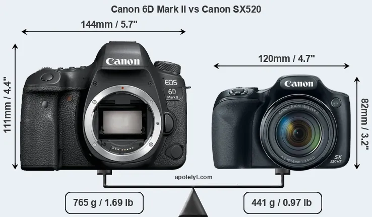 Die physische Größe und das Gewicht der Canon 6D Mark II und der Canon SX520 werden in der nachfolgenden Graphik illustriert. Die beiden Kameras werden entsprechend ihrer relativen Größe dargestellt. Alle Größenangaben sind auf den nächsten Millimeter gerundet.