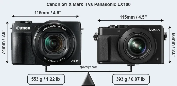 Die physische Größe und das Gewicht der Canon G1 X Mark II und der Panasonic LX100 werden in der nachfolgenden Graphik illustriert. Die beiden Kameras werden entsprechend ihrer relativen Größe dargestellt. Alle Größenangaben sind auf den nächsten Millimeter gerundet.