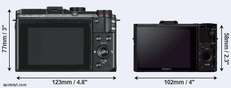 Die physische Größe und das Gewicht der Canon G3 X und der Sony RX100 II werden in der nachfolgenden Graphik illustriert. Die beiden Kameras werden entsprechend ihrer relativen Größe dargestellt. Alle Größenangaben sind auf den nächsten Millimeter gerundet.
