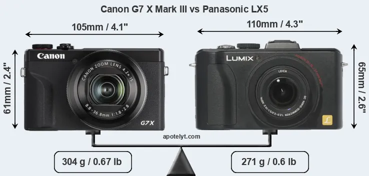 Die physische Größe und das Gewicht der Canon G7 X Mark III und der Panasonic LX5 werden in der nachfolgenden Graphik illustriert. Die beiden Kameras werden entsprechend ihrer relativen Größe dargestellt. Alle Größenangaben sind auf den nächsten Millimeter gerundet.