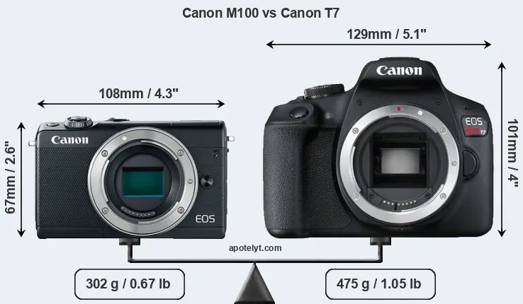 Die physische Größe und das Gewicht der Canon M100 und der Canon T7 werden in der nachfolgenden Graphik illustriert. Die beiden Kameras werden entsprechend ihrer relativen Größe dargestellt. Alle Größenangaben sind auf den nächsten Millimeter gerundet.