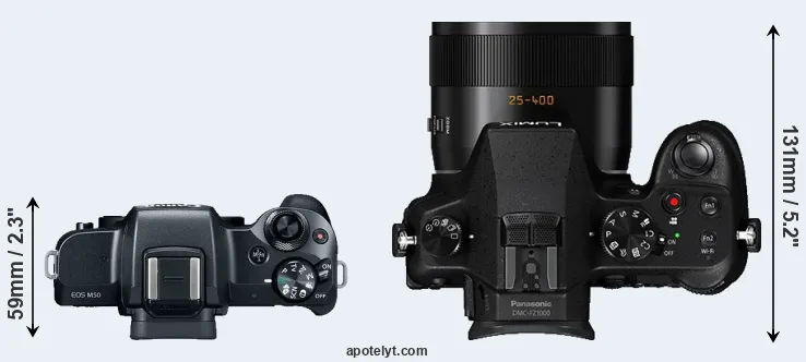 Die physische Größe und das Gewicht der Canon M50 und der Panasonic FZ1000 werden in der nachfolgenden Graphik illustriert. Die beiden Kameras werden entsprechend ihrer relativen Größe dargestellt. Alle Größenangaben sind auf den nächsten Millimeter gerundet.