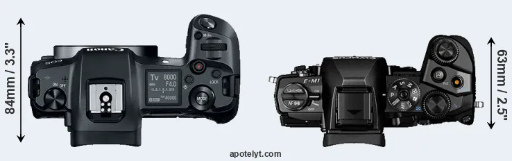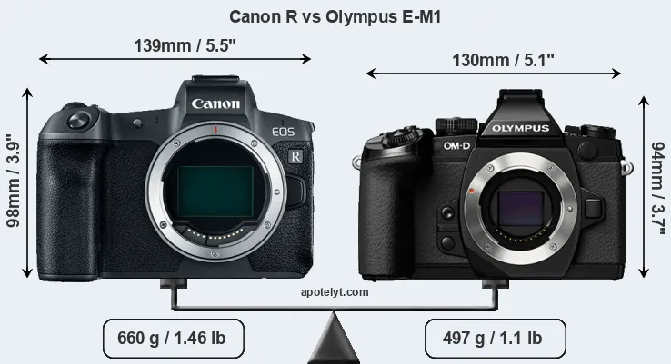 Die physische Größe und das Gewicht der Canon R und der Olympus E-M1 werden in der nachfolgenden Graphik illustriert. Die beiden Kameras werden entsprechend ihrer relativen Größe dargestellt. Alle Größenangaben sind auf den nächsten Millimeter gerundet.