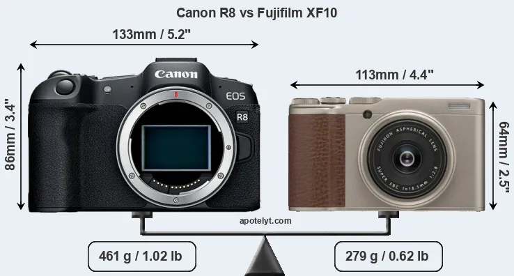 Die physische Größe und das Gewicht der Canon R8 und der Fujifilm XF10 werden in der nachfolgenden Graphik illustriert. Die beiden Kameras werden entsprechend ihrer relativen Größe dargestellt. Alle Größenangaben sind auf den nächsten Millimeter gerundet.