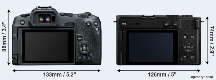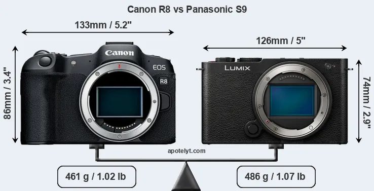 Die physische Größe und das Gewicht der Canon R8 und der Panasonic S9 werden in der nachfolgenden Graphik illustriert. Die beiden Kameras werden entsprechend ihrer relativen Größe dargestellt. Alle Größenangaben sind auf den nächsten Millimeter gerundet.