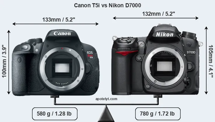 Die physische Größe und das Gewicht der Canon T5i und der Nikon D7000 werden in der nachfolgenden Graphik illustriert. Die beiden Kameras werden entsprechend ihrer relativen Größe dargestellt. Alle Größenangaben sind auf den nächsten Millimeter gerundet.