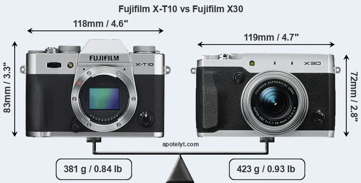 Die physische Größe und das Gewicht der Fujifilm X-T10 und der Fujifilm X30 werden in der nachfolgenden Graphik illustriert. Die beiden Kameras werden entsprechend ihrer relativen Größe dargestellt. Alle Größenangaben sind auf den nächsten Millimeter gerundet.