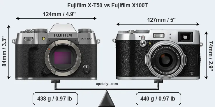 Die physische Größe und das Gewicht der Fujifilm X-T50 und der Fujifilm X100T werden in der nachfolgenden Graphik illustriert. Die beiden Kameras werden entsprechend ihrer relativen Größe dargestellt. Alle Größenangaben sind auf den nächsten Millimeter gerundet.