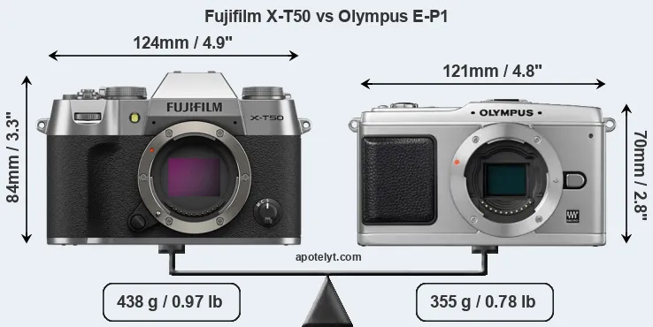 Die physische Größe und das Gewicht der Fujifilm X-T50 und der Olympus E-P1 werden in der nachfolgenden Graphik illustriert. Die beiden Kameras werden entsprechend ihrer relativen Größe dargestellt. Alle Größenangaben sind auf den nächsten Millimeter gerundet.