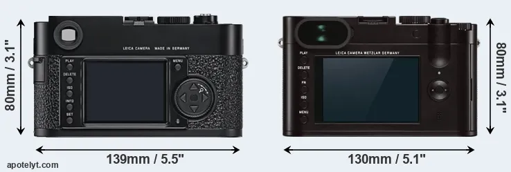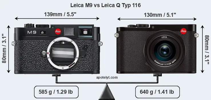 Die Leica M9 und die Leica Q (Typ 116) sind zwei digitale Kameras, die im September 2009 beziehungsweise im Juni 2015 vorgestellt wurden. Die M9 is eine spiegellose Wechselobjektivkamera mit Messsucherfokussierung, während es sich bei der Q Typ 116 um eine Kompaktkamera mit integriertem Objektiv handelt. Beide Kameras sind mit einem Vollformatsensor ausgerüstet. Die M9 hat eine Auflösung von 18,1 Megapixel, während die Q Typ 116 24,0 MP bietet.