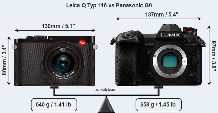 Die physische Größe und das Gewicht der Leica Q Typ 116 und der Panasonic G9 werden in der nachfolgenden Graphik illustriert. Die beiden Kameras werden entsprechend ihrer relativen Größe dargestellt. Alle Größenangaben sind auf den nächsten Millimeter gerundet.