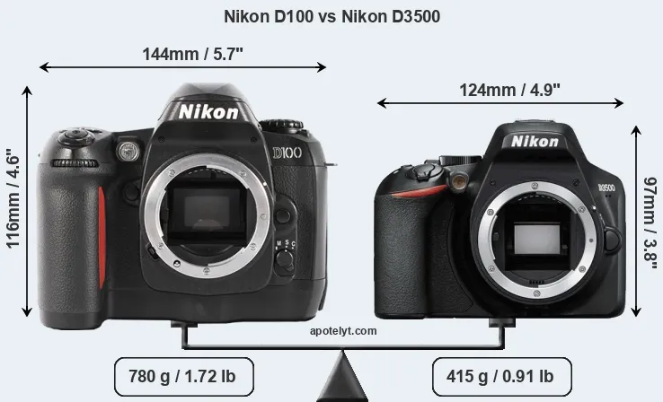 Die physische Größe und das Gewicht der Nikon D100 und der Nikon D3500 werden in der nachfolgenden Graphik illustriert. Die beiden Kameras werden entsprechend ihrer relativen Größe dargestellt. Alle Größenangaben sind auf den nächsten Millimeter gerundet.