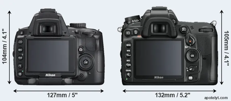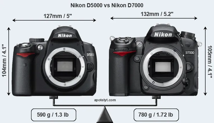 Die physische Größe und das Gewicht der Nikon D5000 und der Nikon D7000 werden in der nachfolgenden Graphik illustriert. Die beiden Kameras werden entsprechend ihrer relativen Größe dargestellt. Alle Größenangaben sind auf den nächsten Millimeter gerundet.