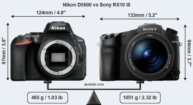 Die physische Größe und das Gewicht der Nikon D5600 und der Sony RX10 III werden in der nachfolgenden Graphik illustriert. Die beiden Kameras werden entsprechend ihrer relativen Größe dargestellt. Alle Größenangaben sind auf den nächsten Millimeter gerundet.