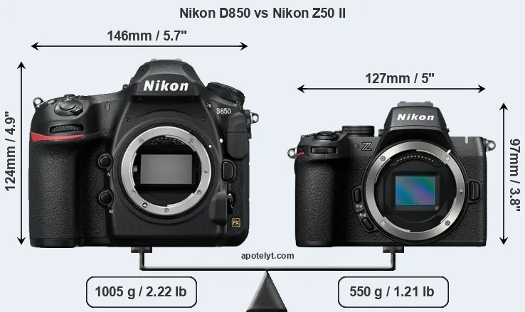 Die physische Größe und das Gewicht der Nikon D850 und der Nikon Z50 II werden in der nachfolgenden Graphik illustriert. Die beiden Kameras werden entsprechend ihrer relativen Größe dargestellt. Alle Größenangaben sind auf den nächsten Millimeter gerundet.