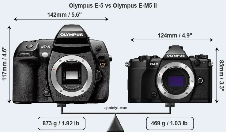 Die Olympus E-5 und die Olympus OM-D E-M5 Mark II sind zwei digitale Kameras, die im September 2010 beziehungsweise im Februar 2015 vorgestellt wurden. Die E-5 is eine digitale Spiegelreflexkamera, während es sich bei der E-M5 II um eine spiegellose Wechselobjektivkamera handelt. Beide Kameras sind mit einem Four Thirds sensor ausgerüstet. Die E-5 hat eine Auflösung von 12,2 Megapixel, während die E-M5 II 15,9 MP bietet.