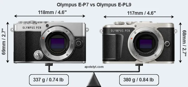 Die physische Größe und das Gewicht der Olympus E-P7 und der Olympus E-PL9 werden in der nachfolgenden Graphik illustriert. Die beiden Kameras werden entsprechend ihrer relativen Größe dargestellt. Alle Größenangaben sind auf den nächsten Millimeter gerundet.
