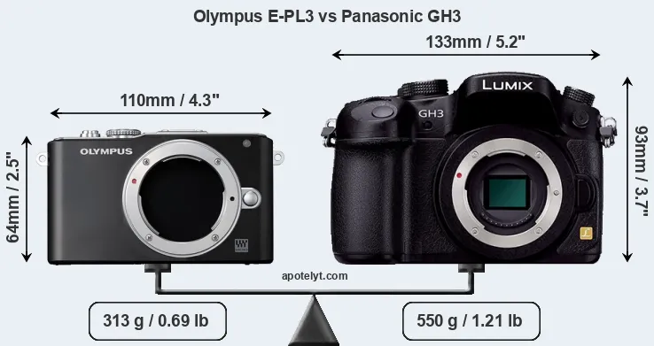 Die physische Größe und das Gewicht der Olympus E-PL3 und der Panasonic GH3 werden in der nachfolgenden Graphik illustriert. Die beiden Kameras werden entsprechend ihrer relativen Größe dargestellt. Alle Größenangaben sind auf den nächsten Millimeter gerundet.