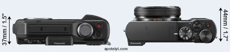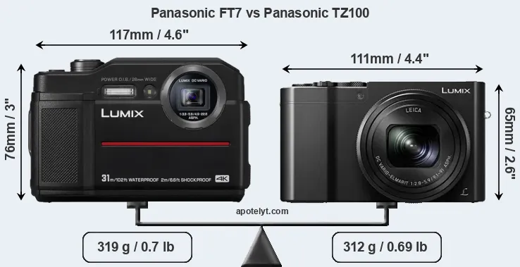 Die physische Größe und das Gewicht der Panasonic FT7 und der Panasonic TZ100 werden in der nachfolgenden Graphik illustriert. Die beiden Kameras werden entsprechend ihrer relativen Größe dargestellt. Alle Größenangaben sind auf den nächsten Millimeter gerundet.