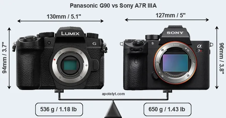 Die physische Größe und das Gewicht der Panasonic G90 und der Sony A7R IIIA werden in der nachfolgenden Graphik illustriert. Die beiden Kameras werden entsprechend ihrer relativen Größe dargestellt. Alle Größenangaben sind auf den nächsten Millimeter gerundet.