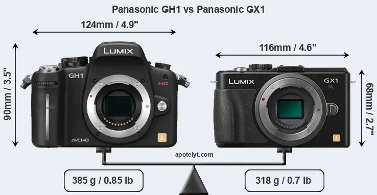 Die physische Größe und das Gewicht der Panasonic GH1 und der Panasonic GX1 werden in der nachfolgenden Graphik illustriert. Die beiden Kameras werden entsprechend ihrer relativen Größe dargestellt. Alle Größenangaben sind auf den nächsten Millimeter gerundet.