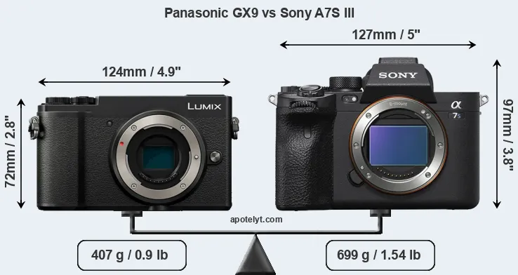 Die physische Größe und das Gewicht der Panasonic GX9 und der Sony A7S III werden in der nachfolgenden Graphik illustriert. Die beiden Kameras werden entsprechend ihrer relativen Größe dargestellt. Alle Größenangaben sind auf den nächsten Millimeter gerundet.