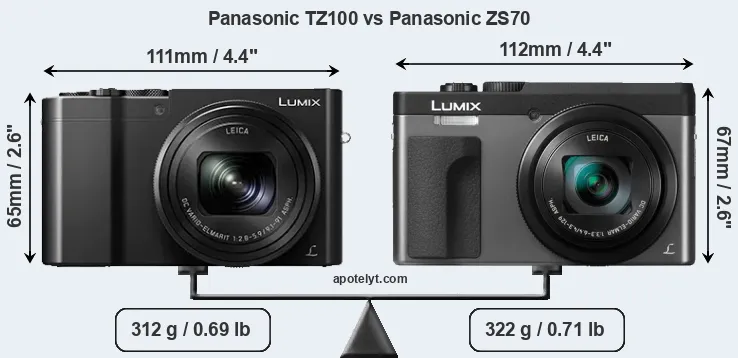 Die physische Größe und das Gewicht der Panasonic TZ100 und der Panasonic ZS70 werden in der nachfolgenden Graphik illustriert. Die beiden Kameras werden entsprechend ihrer relativen Größe dargestellt. Alle Größenangaben sind auf den nächsten Millimeter gerundet.