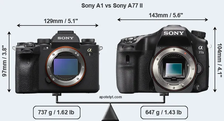 Die physische Größe und das Gewicht der Sony A1 und der Sony A77 II werden in der nachfolgenden Graphik illustriert. Die beiden Kameras werden entsprechend ihrer relativen Größe dargestellt. Alle Größenangaben sind auf den nächsten Millimeter gerundet.