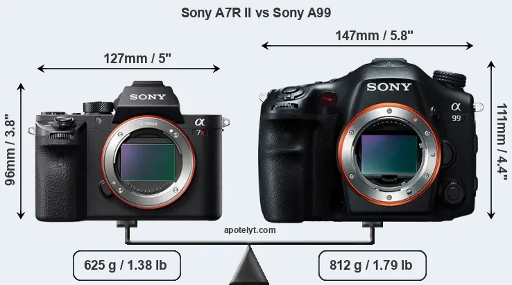 Die physische Größe und das Gewicht der Sony A7R II und der Sony A99 werden in der nachfolgenden Graphik illustriert. Die beiden Kameras werden entsprechend ihrer relativen Größe dargestellt. Alle Größenangaben sind auf den nächsten Millimeter gerundet.