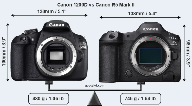 El tamaño físico y el peso de Canon 1200D y Canon R5 Mark II se ilustran en el siguiente gráfico. Las dos cámaras se muestran según su tamaño relativo. Todas las dimensiones están redondeadas al milímetro más cercano.