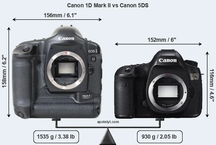 Más allá de esta instantánea de las funciones y características principales, ¿cuáles son las diferencias entre la Canon EOS-1D Mark II y la Canon EOS 5DS? ¿Cuál camara deberías comprar? Siga leyendo para descubrir cómo se comparan estas dos cámaras con respecto al tamaño de su cuerpo y otras caracteristicas.