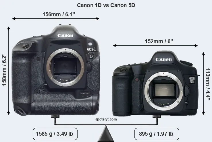 El tamaño físico y el peso de Canon 1D y Canon 5D se ilustran en el siguiente gráfico. Las dos cámaras se muestran según su tamaño relativo. Todas las dimensiones están redondeadas al milímetro más cercano.