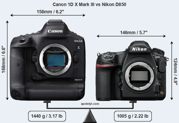 El tamaño físico y el peso de Canon 1D X Mark III y Nikon D850 se ilustran en el siguiente gráfico. Las dos cámaras se muestran según su tamaño relativo. Todas las dimensiones están redondeadas al milímetro más cercano.