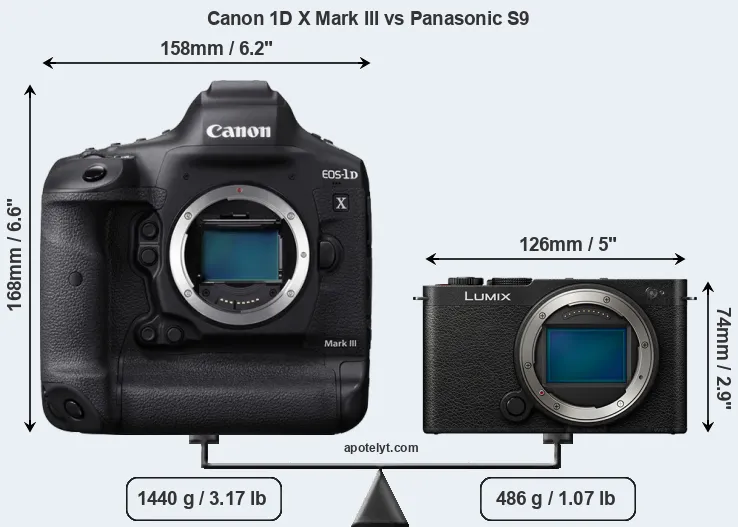 El tamaño físico y el peso de Canon 1D X Mark III y Panasonic S9 se ilustran en el siguiente gráfico. Las dos cámaras se muestran según su tamaño relativo. Todas las dimensiones están redondeadas al milímetro más cercano.