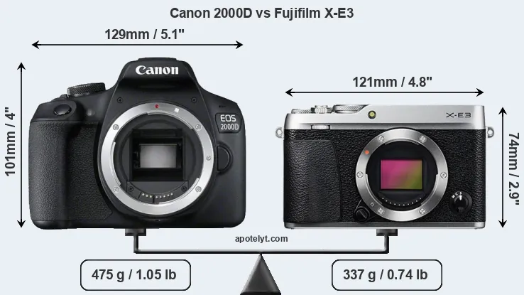 La Canon EOS 2000D y la Fujifilm X-E3 son dos cámaras digitales que fueron reveladas al público, respectivamente, en febrero de 2018 y septiembre de 2017. La 2000D es una cámara DSLR, mientras que la X-E3 es una cámara de objectivos intercambiables sin espejo.Ambas cámaras están equipados con un sensor de fotograma APS-C. Ambas cámaras ofrecen una resolución de 24,0 megapíxeles.