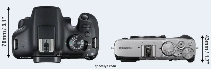 El tamaño físico y el peso de Canon 2000D y Fujifilm X-E3 se ilustran en el siguiente gráfico. Las dos cámaras se muestran según su tamaño relativo. Todas las dimensiones están redondeadas al milímetro más cercano.