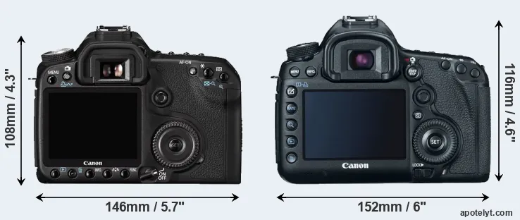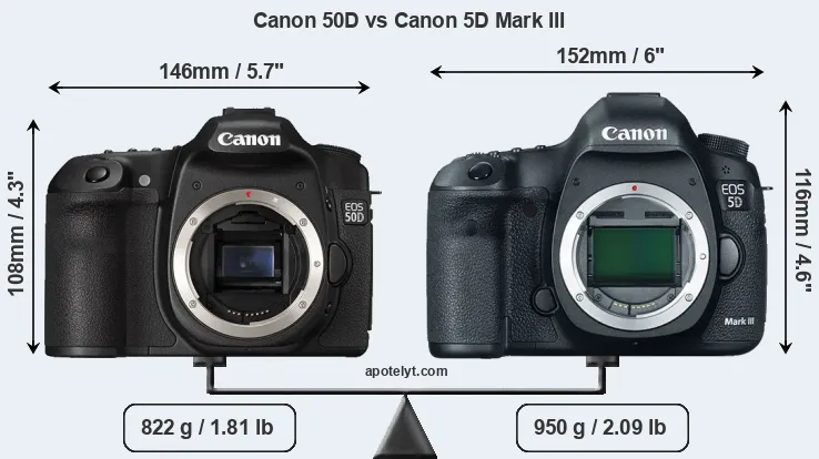 El tamaño físico y el peso de Canon 50D y Canon 5D Mark III se ilustran en el siguiente gráfico. Las dos cámaras se muestran según su tamaño relativo. Todas las dimensiones están redondeadas al milímetro más cercano.