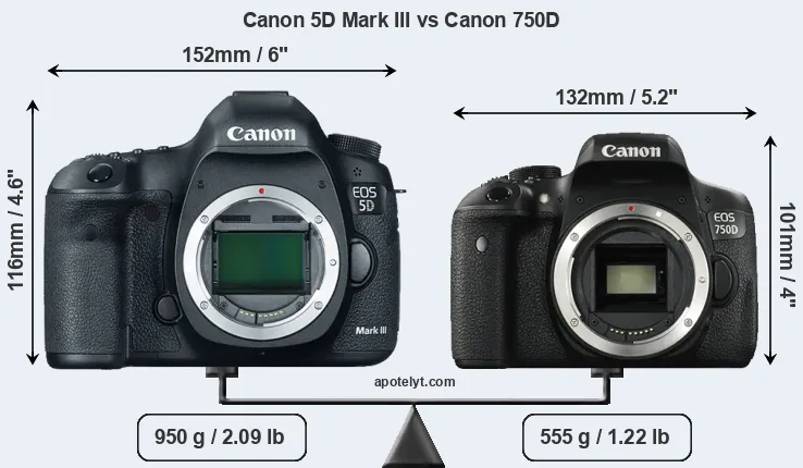 El tamaño físico y el peso de Canon 5D Mark III y Canon 750D se ilustran en el siguiente gráfico. Las dos cámaras se muestran según su tamaño relativo. Todas las dimensiones están redondeadas al milímetro más cercano.