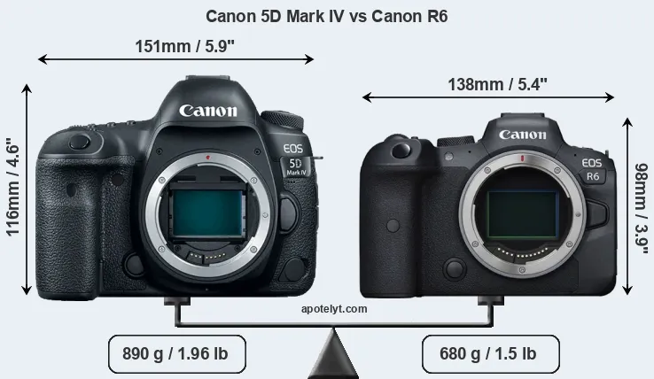 La Canon EOS 5D Mark IV y la Canon EOS R6 son dos cámaras digitales que fueron reveladas al público, respectivamente, en agosto de 2016 y julio de 2020. La 5D Mark IV es una cámara DSLR, mientras que la R6 es una cámara de objectivos intercambiables sin espejo.Ambas cámaras están equipados con un sensor de fotograma completo. La 5D Mark IV tiene una resolución de 30,1 megapíxeles, mientras que la R6 proporciona 20,0 MP.