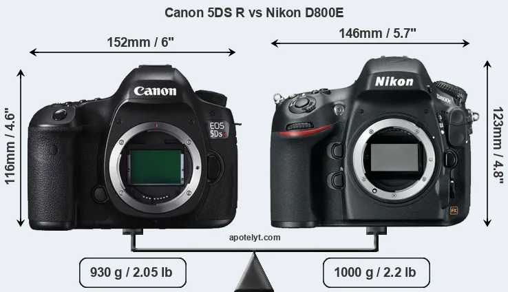 El tamaño físico y el peso de Canon 5DS R y Nikon D800E se ilustran en el siguiente gráfico. Las dos cámaras se muestran según su tamaño relativo. Todas las dimensiones están redondeadas al milímetro más cercano.