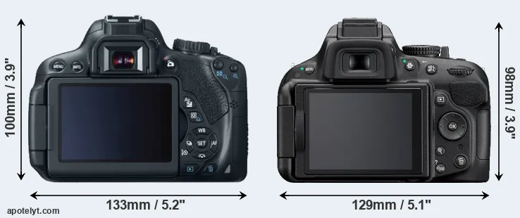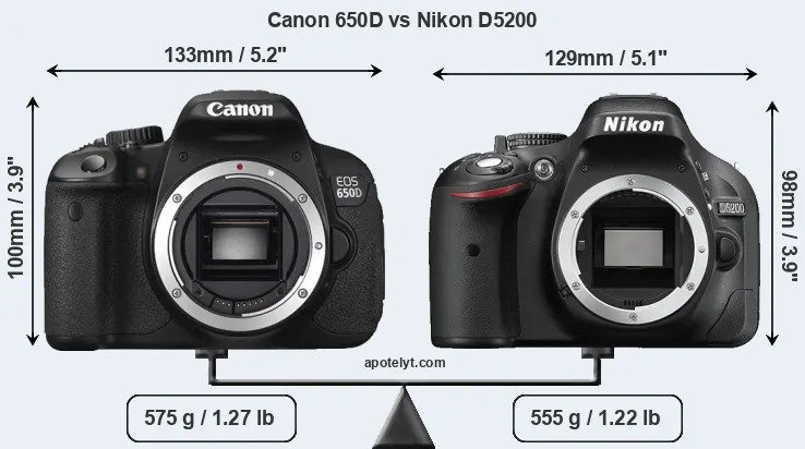 El tamaño físico y el peso de Canon 650D y Nikon D5200 se ilustran en el siguiente gráfico. Las dos cámaras se muestran según su tamaño relativo. Todas las dimensiones están redondeadas al milímetro más cercano.