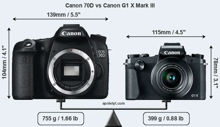 El tamaño físico y el peso de Canon 70D y Canon G1 X Mark III se ilustran en el siguiente gráfico. Las dos cámaras se muestran según su tamaño relativo. Todas las dimensiones están redondeadas al milímetro más cercano.