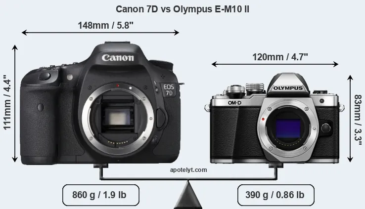 El tamaño físico y el peso de Canon 7D y Olympus E-M10 II se ilustran en el siguiente gráfico. Las dos cámaras se muestran según su tamaño relativo. Todas las dimensiones están redondeadas al milímetro más cercano.