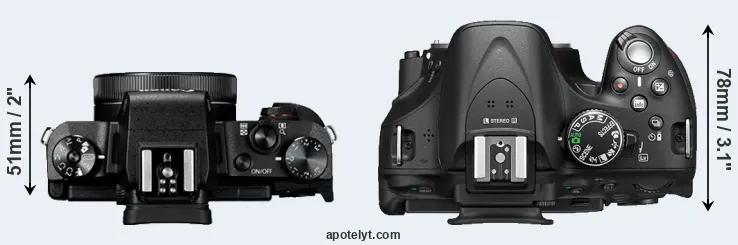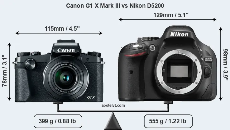 El tamaño físico y el peso de Canon G1 X Mark III y Nikon D5200 se ilustran en el siguiente gráfico. Las dos cámaras se muestran según su tamaño relativo. Todas las dimensiones están redondeadas al milímetro más cercano.