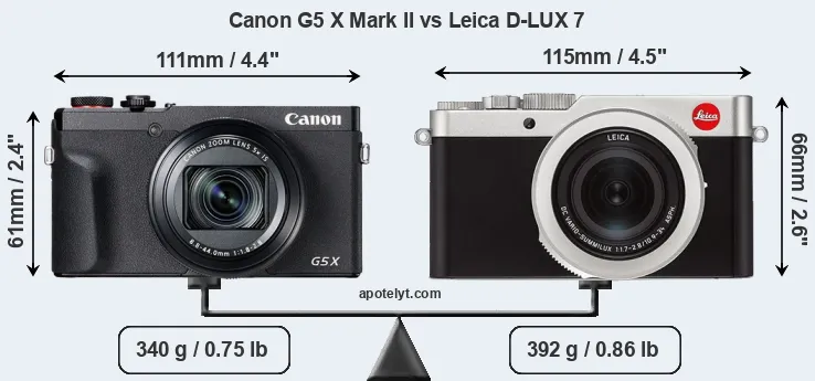 La Canon PowerShot G5 X Mark II y la Leica D-LUX 7 son dos cámaras digitales que fueron reveladas al público, respectivamente, en julio de 2019 y noviembre de 2018. Tanto la G5X Mark II y la D-LUX 7 son cámaras compactas de objectivo incorporada, que están equipados con un sensor de 1 pulgada (G5X Mark II) y un sensor de cuatro tercios (D-LUX 7). La Canon tiene una resolución de 20,0 megapíxeles, mientras que la Leica proporciona 16,8 MP.