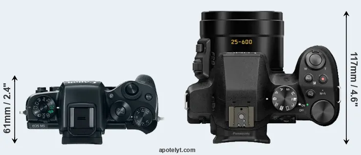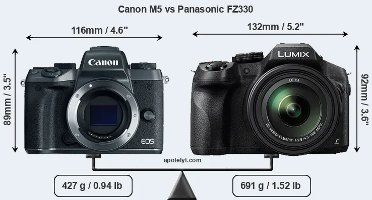 La Canon EOS M5 y la Panasonic Lumix DMC-FZ330 son dos cámaras digitales que fueron reveladas al público, respectivamente, en septiembre de 2016 y julio de 2015. La M5 es una cámara de objectivos intercambiables sin espejo, mientras que la FZ330 es una cámara compacta con objectivo incorporada. Las cámaras son equipados con un sensor de fotograma APS-C (M5) y un sensor de 1/2,3 pulgada (FZ330). La Canon tiene una resolución de 24,0 megapíxeles, mientras que la Panasonic proporciona 12,0 MP.