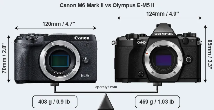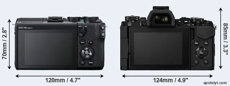 La Canon EOS M6 Mark II y la Olympus OM-D E-M5 Mark II son dos cámaras digitales que fueron reveladas al público, respectivamente, en agosto de 2019 y febrero de 2015. Ambas son cámaras cámara de objectivos intercambiables sin espejo, que están equipados con un sensor de fotograma APS-C (M6 Mark II) y un sensor de cuatro tercios (E-M5 II). La Canon tiene una resolución de 32,3 megapíxeles, mientras que la Olympus proporciona 15,9 MP.