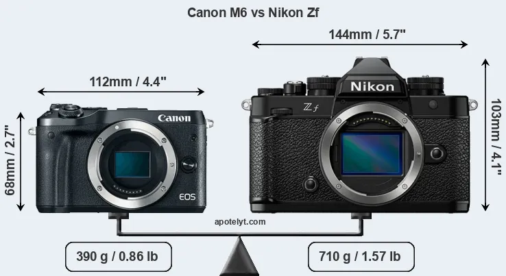 El tamaño físico y el peso de Canon M6 y Nikon Zf se ilustran en el siguiente gráfico. Las dos cámaras se muestran según su tamaño relativo. Todas las dimensiones están redondeadas al milímetro más cercano.