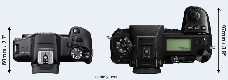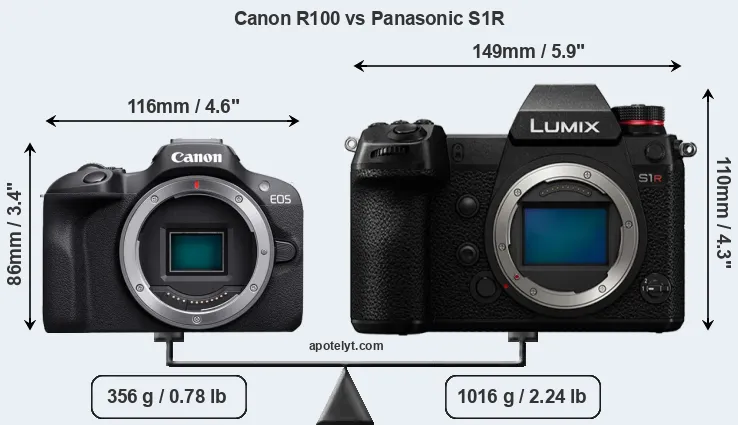 La Canon EOS R100 y la Panasonic Lumix DC-S1R son dos cámaras digitales que fueron reveladas al público, respectivamente, en mayo de 2023 y febrero de 2019. Ambas son cámaras cámara de objectivos intercambiables sin espejo, que están equipados con un sensor de fotograma APS-C (R100) y un sensor de fotograma completo (S1R). La Canon tiene una resolución de 24,0 megapíxeles, mientras que la Panasonic proporciona 46,7 MP.